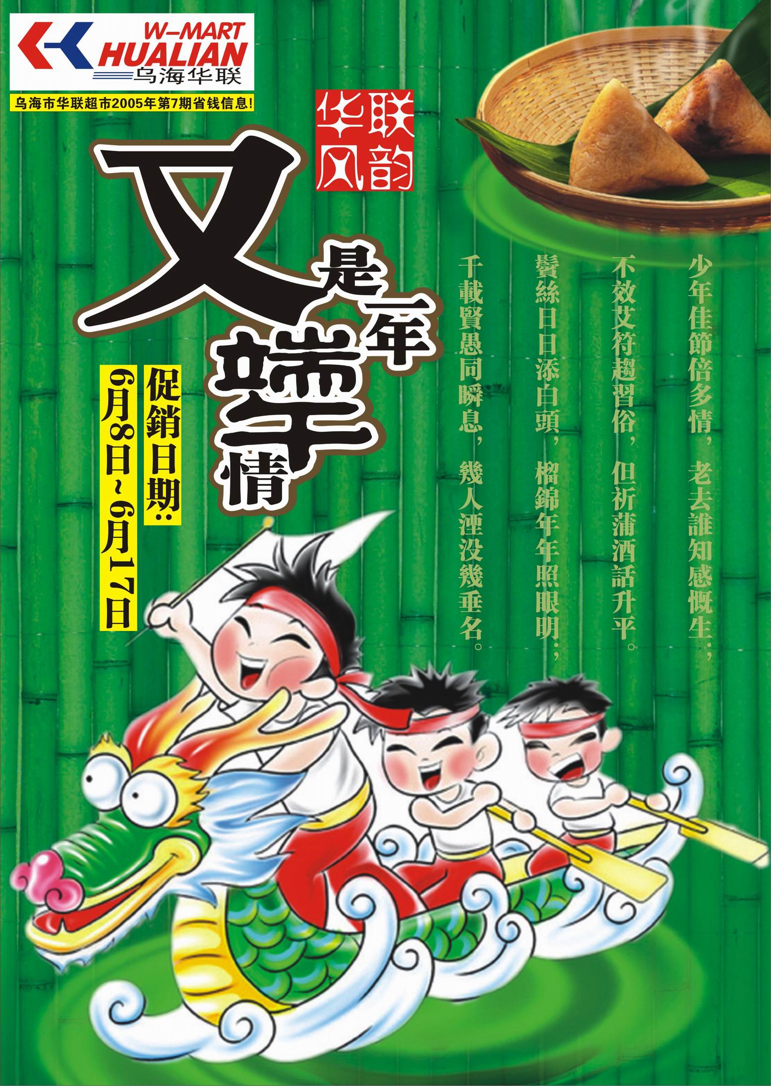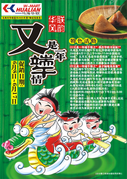 内容:亲爱的顾客朋友, 又是一年端午情!在这个温馨的节日里,我代表**超市所有员工祝你合家欢乐,平安幸福!于2005年6月8日~2005年6月17日华联超市的端午精彩促销又揭开了它欢乐的面纱,盛情欢迎您的光临!**的真情不会变,**人的热情不会变,请您关注本期特价商品信息!