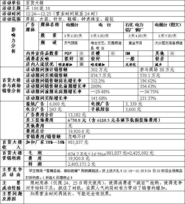 前言:笔者1996年大学毕业即进入当地一家最大的国有老百货商店,在这里一干就是8年,其间先后从事了行政管理、政工、营销岗位,但受益最大的还是在做地区集团营销本部部长的一年。具体经历曾以《一个大商场营销部长的商战实录自述》为题,撰文在网络发表,愿为自省文章,没想到迅速风靡网络,浏览量一度居高不下,而且被多家商业类网站转载。此间结识了来自全国各地的好朋友,很多朋友都向我要《营销效果反馈报告》,但我并没有一一回复。究其原因我还是认为这只是一张普通的表格,其实要想真正做好营销,还是深入实质去实践,笔者将结合自身经历,对“如何做好商场的营销效果分析反馈”做以详细的分析、阐述。 一、我的坎坷营销路 1996年参加工作后,我一直在从事文字工作,1999年被提拔为团委书记,本来在仕途上春风得意的我,因为在汇总一个报表时,对数据的疏忽,挨了副总的批评而走上了营销这条道路。“王震呀,你在企业做了六年,怎么一点业务也不懂呀!”副总的话深深地刺痛了我。我终于下定决心离开现有的岗位,要求下基层学习业务。2002年3月,赶上集团的一个大卖场筹建,要调一批人到外地学习,做为“大卖场”的后备干部,我如愿成行。 经过半年的外地考察和系统的培训,招商部的人员各归其职。任免决定公布后,我成为首任企划经理兼办公室主任,虽然与我学习业务的初衷有所背离,但是毕竟也算是联系紧密,而且在集团中营销人才也很短缺。由于大卖场的营运和采购分离运作,我颇受“营采分离”的困惑,促销方案得不到配送中心(采购部)的支持,半年间,只有圣诞活动比较成功,得到了集团总裁的褒奖,而这次活动也完全是凭我“一已之力”运作而成。而没有商品的支持,促销活动等于是“无源之水、无本之木”,在副店长的“鼓动”下,我决定试着改变一下自己的命运,鼓足勇气向老总递交了《关于成立超市集团营销部的建议书》。在大卖场工作了半年后,我又用自己的努力赢得了属于自己的一片天空——受命组建集团营销本部。但经历了一波三折后(短命夭折,独立工作半年,再次组建),我名正言顺地成为了地区集团的营销本部部长。这对我是一个难得的机遇,也是巨大的挑战。通过一年来的全年营销贩促活动的开展,我对营销活动有了更深刻的认识。 二、营销活动不能忽视自然增长率 一般商场在做销售分析时,往往只做同期比,而忽视了自然增长率这个最重要的比率因素。笔者在任职期间,主抓营销工作的副总是业务老总,这也是营销工作首次由业务老总主抓。事实上,我从他的身上也学到了不少东西,最重要的一个数据分析就是自然增长率与同期增长率的比较,得到实际增长率,这个是我以前所没有想到的。而从全年的营销活动来看,如果去除自然增长率部分,单看同期增长率,是不客观也不准备的。这个自然增长率既包括商场内部品牌、结构调整、引进的因素,也包括社会因素的影响,天气、非常事件、国家政策出台等等。所以商场在考虑营销活动实际效果的同时,也要考虑自然增长率,用同期增长率减去自然增长率得出的才是实际增长率。 举例说明,在七月份搞的一次“幸运大转盘,购物就旅游”活动中,活动档期为13天。各项数据分析如下,预计销售额是1594万元(用当月销售计划除以月份天数再乘以活动档期);实际销售额是1767万元,同比增长率为1.1%,比前期增长率是12.62%(前期销售额即活动开始头一天向前推一个档期,但要考虑双休日的天数),前期比同期增长率(即自然增长率)为—10.24%。单看这个数字,是负增长的,也就是说搞活动之前一直是负增长的,但用同期增长减去自然增长率,得出的11.34%才是实际增长的数字,这要远比1.1%的同比数字要高。其实这次活动虽然采取了转盘摇奖的促销方式,表面看似热闹,人流要经常排到堵塞卖场通道,但是较同期的增长还是少得可怜,如果单从这个层面分析,这次活动至少不算成功,但考虑到前期的销售一直处于下降态势,最终的实际增长还是比较可人的。 附:《幸运大转盘,购物就旅游营销效果反馈报告-----销售分析》 活动期间预计销售额 1,594万元 活动期间实现销售额 1,767万元 活动期间销售额同比增长率 1.1% 活动期间销售额比前期增长率 12.62% 活动期间前期比同期增长率 —10.24% 活动期间实际增长率 11.34% 销售的增长是比较复杂的,在数据比较分析时,要考虑到前期和同期档期的双休日天数对比情况,及有无大型促销活动同期举办,如果数据分析对等,这样的数据是可信的。商场的变化是绝对的,不变是相对的,变化就为销售的增长提供了一个契机,品种的引进,业态的增长都会带来销售的直接增长。如果不考虑这个因素,那么促销活动的增长率就显得不够客观。 三、要学会控制营销费用率 现在有些企业的老总只愿看到活动轰轰烈烈,声势浩浩荡荡,人流熙熙攘攘,而忽视了活动的费用控制问题,一味地省钱,或大把地“烧钱”都不可取。这就需要商场的营销决策者们通过全年的营销活动客观、细致地分析活动的费用,确定一个合理的费用率区间。在合理的费用率区间内确定活动的投入,当然可根据竞争对手和活动的重要程度灵活调整。营销活动的费用一般包括媒体广告投入,店面装饰、赠品、DM广告、会员积分等费用。下面笔者予以具体的分析。 1、媒体广告费用控制 这部分费用取决于活动的重要