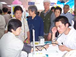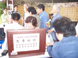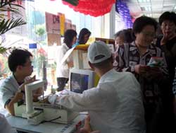 在开业现场,我们看见药店门口两边排队领取赠品的队伍就有一二十米长,不停地有人加入。店内更是人头攒动、热闹非凡。特别是现场免费的检测和咨询活动,吸引了不少顾客前来试验和咨询。