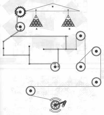 在下面一组杠杆、齿轮和转轮的组合中,黑色的点是固定支点,灰色的点是不固定的支点,如果如图示转动摇把,上端A和B的物体哪一个上升哪一个下降?