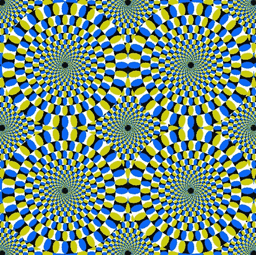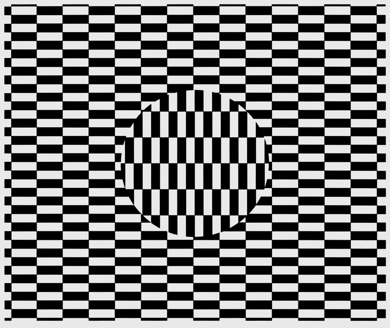 Ouchi幻觉:来回翻这一页,图案中心部分似乎在沿着与周围图案相反的方向移动。而且中心部分的纵深度似乎也与其它部分不同。