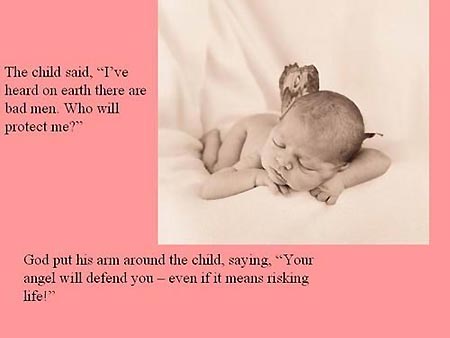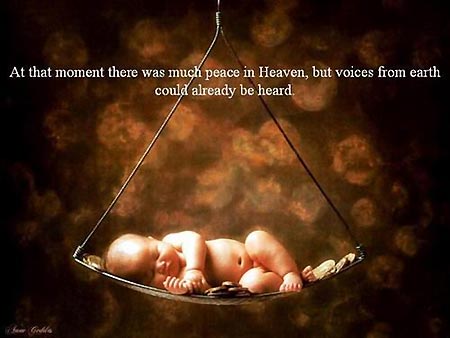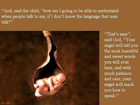 “这很简单,”上帝说,“你的天使将教会你语言中最美丽和最甜蜜的词语,带着最大的耐心和关怀,你的天使将教会你怎样说话。