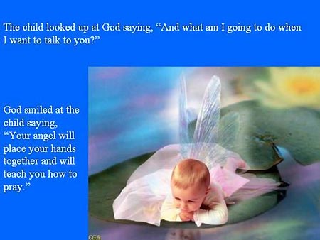 上帝微笑着对小孩说,“你的天使会把你的双手放在一起然后教会你怎样祈祷。”