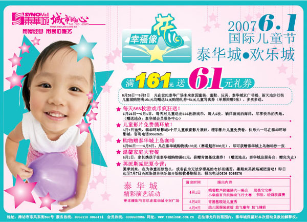 这个画面有点散!如果把主题在明显一些感觉会更好些!活动内容我感觉应该再小一些!主体应该表现欢乐城!而不应该是满161送61,欢乐的气氛应该再营造一下!