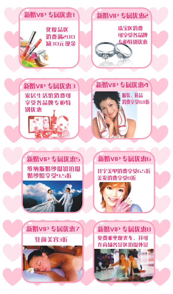 | 凡于2007登记的新人,均可持结婚证到红博世纪广场办理VIP贵宾卡,同时可获赠红博世纪广场提供的“新婚购物 红博送礼”新婚VIP卡,享受新人专属超值优惠。