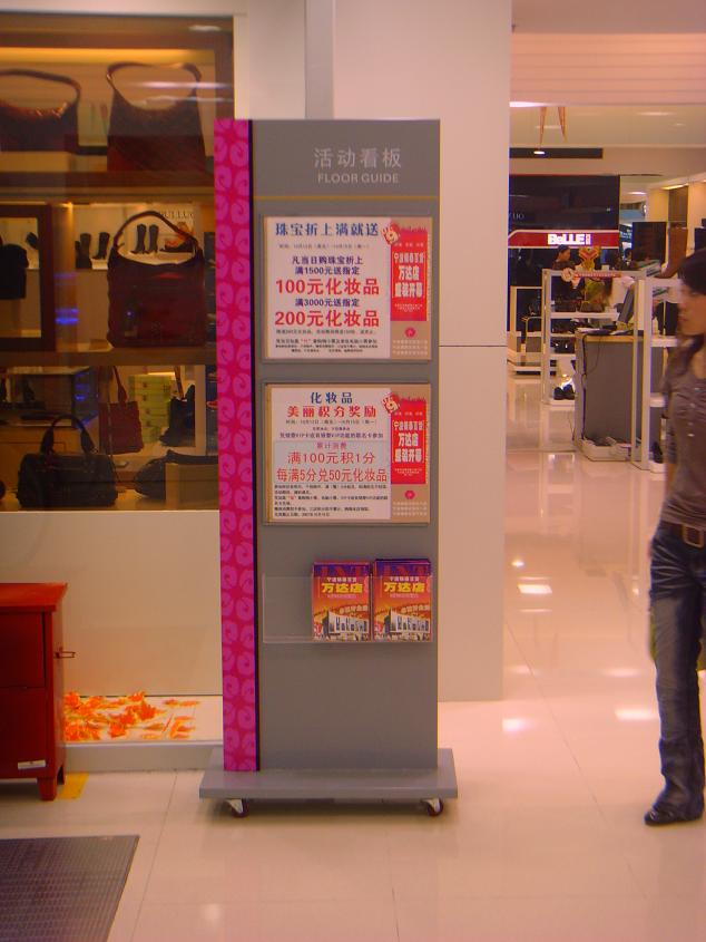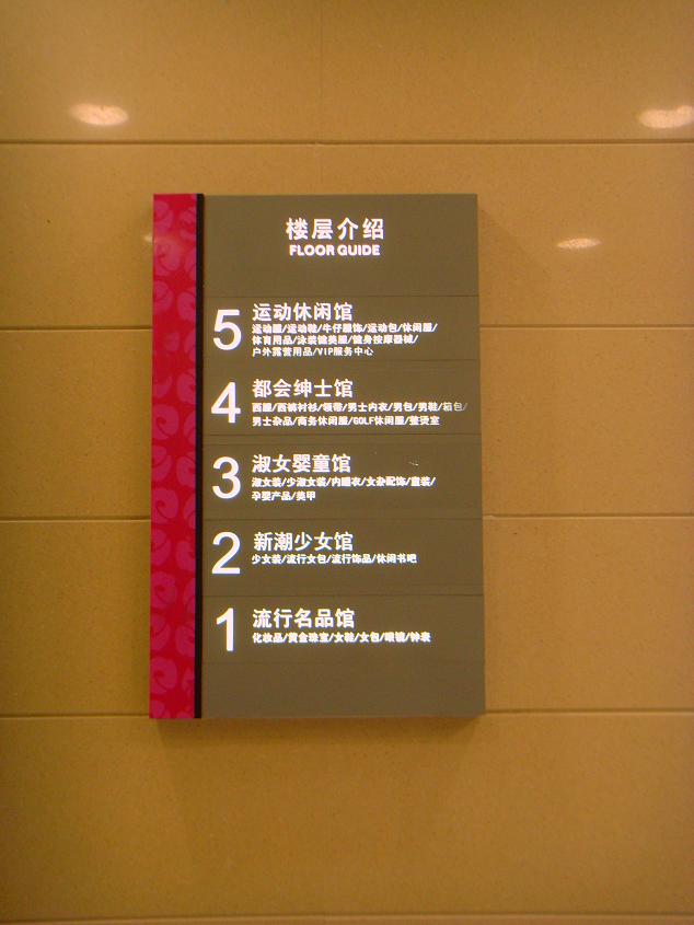 所谓商场的标识导向系统,指表现商场功能区域的空间结构的环境信息,包括导购图、指示牌、地面标记等。目前,大部分商场的导向系统还停留在简单标识的阶段,只是在楼层入口处悬挂一块指示标牌,标出该楼层的商品,楼层内悬挂一些“出口”,“卫生间”等简单指示牌。这种导向系统不能说是从客户的角度出发,为消费者设计的。