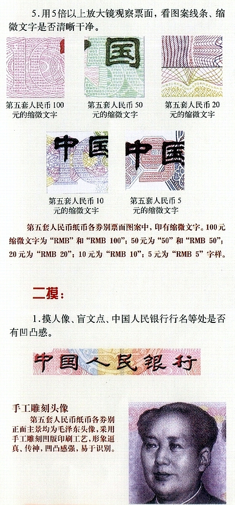 5.雕刻凹版印刷:各券别正面主景毛泽东头像、“中国人民币银行”行名、面额数字、盲文面额标记和背面主景图案(20元、1元纸币除外)等均采用雕刻凹版印刷,用手指触摸有明显凹凸感。