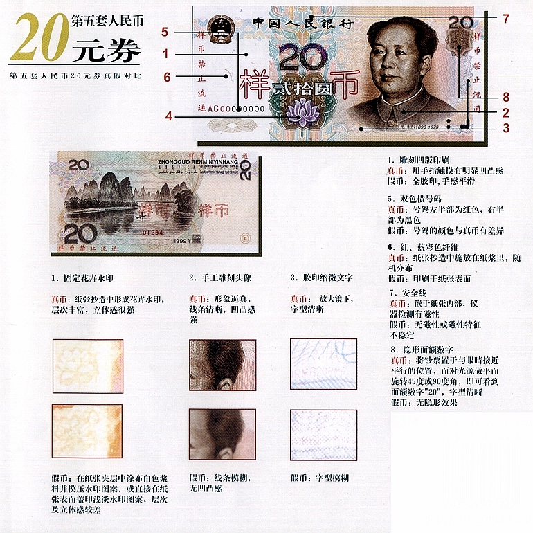 1.固定水印:均位于各面正面左侧空白处,迎光透视,可以看到立体感很强的水印。100元、50元纸币的固定水印为毛泽东头像图案;20元、10元、5元、1元纸币的固定水印分别为荷 花、月季花、水仙花和兰花图案。