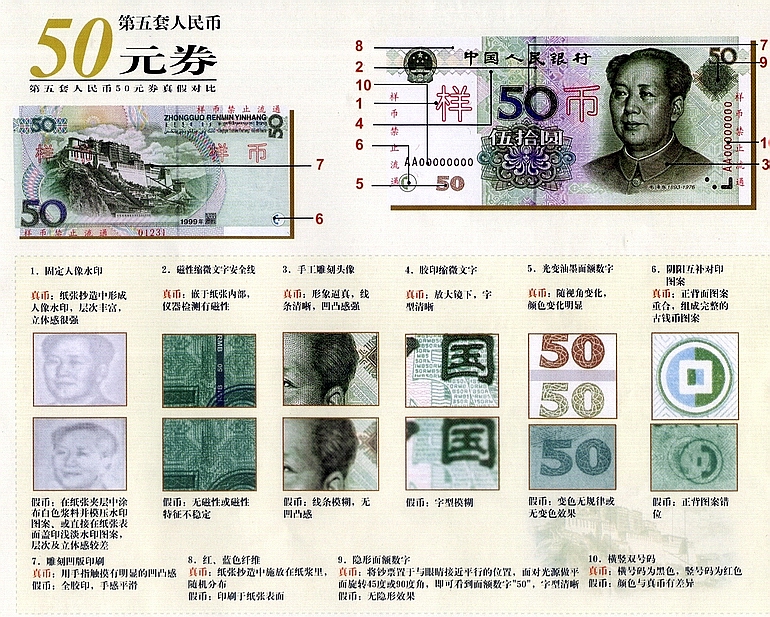 第五套人民币应用了多项成熟的具有国际先进水平的防伪技术,如固定水印、光变油墨印刷图案、全息磁性开窗安全线、隐形面额数字、横竖双号码、双色横号码阴阳互补对印图案、胶印缩微文字、红蓝彩色纤维、白水印、硬币边部滚字等多项技术。这些防伪技术的采用,大大提高了人民币的机读能力,便于清分机、验钞机清分、识别。第五套人民币纸币的主要防伪特征如下: