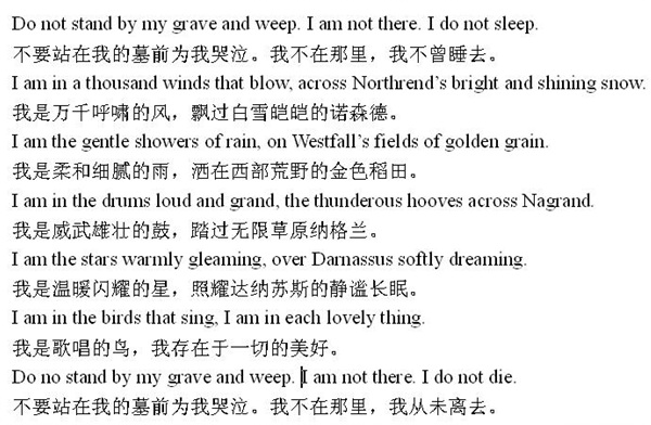 不要站在我的墓前为我哭泣。我不在那里,我不曾睡去。