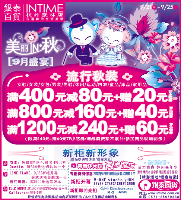 银泰就是惯用蓝紫和紫红色调加吉祥物来营造气氛,其实宣传作品的好坏和其所属企业的知名度、影响力有直接的关系,企业成功就能引导人们的欣赏感知!