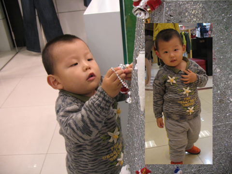 午饭后在爬上凳子摆弄妈妈的化妆品,妈妈看着镜子问我: