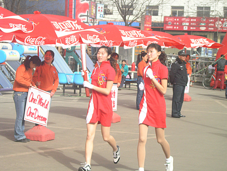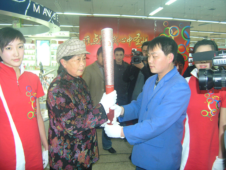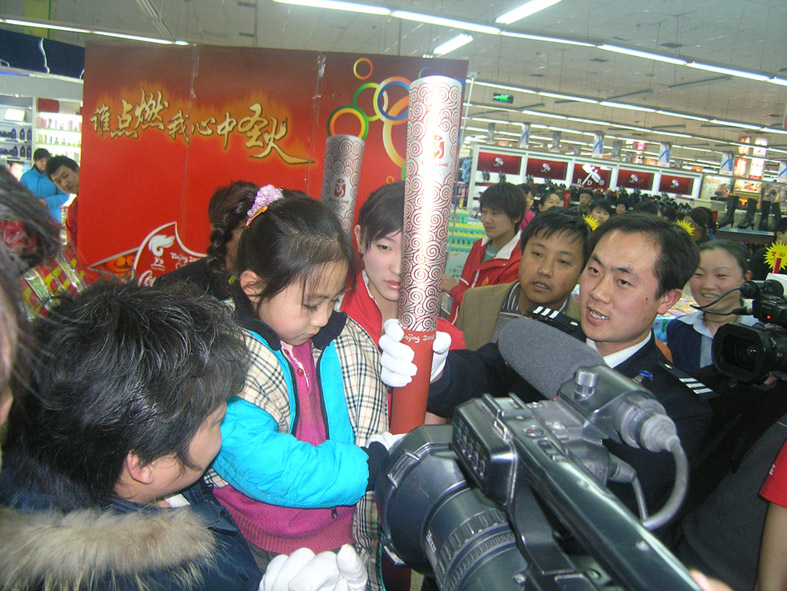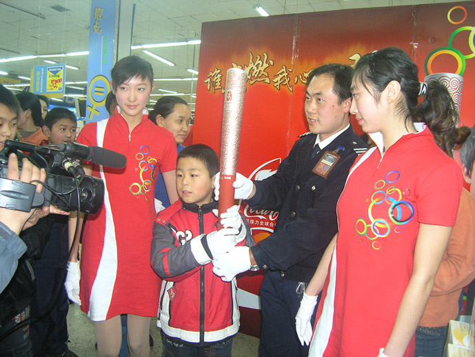 流程阐述:由可口可乐公司的火炬手将“祥云”火炬传到山姆士建南店广场入口处,随后由山姆士超市冯总带领参加活动人员迎接火炬到达活动主席台,先后由可口可乐火炬手、山姆士超市冯总讲话,最后进行火炬交接。
