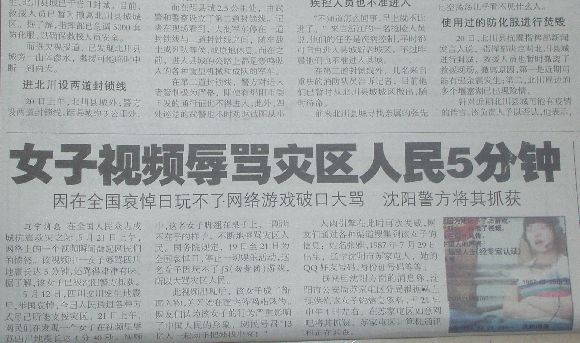 5月12日,四川汶川发生地震后,举国哀悼,全国人民通过各种方式尽己所能支援灾区。21日上午,网民们在发现一个女子在视频里辱骂四川地震长达4分40秒。视频中,这名女子脚翘在桌子上,一副满不在乎的样子,不断的辱骂灾区人民。国务院规定,19日至21日,全国停止一切娱乐活动,这名女子因玩不了J5游戏,所以大骂灾区人民。
