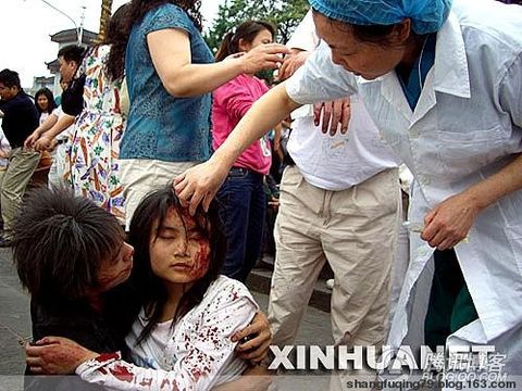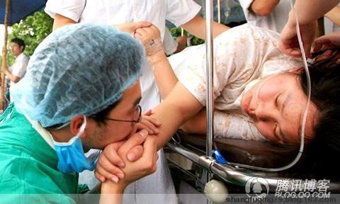 ——5月12日地震后,成都锦江区妇产科医院将临盆的产妇转移到室外,这位陪伴妻子的丈夫给妻子送上深情一吻。