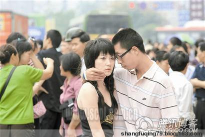 ——5月12日地震发生后,西安街头一对情侣互相安慰,女孩含着眼泪。(华西都市报)