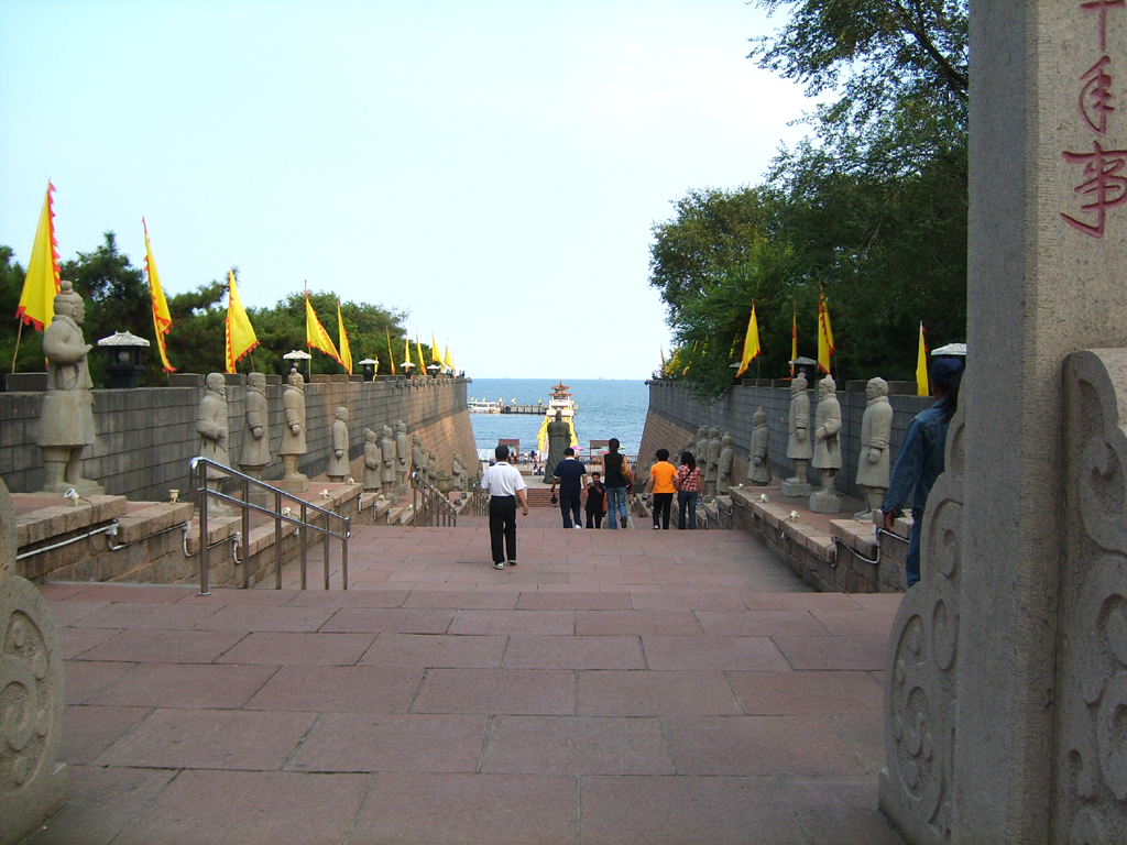 看好房间以后,已经是下午16:00(上午10:00出发的)。开车从文化路直接南下到头左转,到东山街即到。行程中穿过市区,路标明显,不必担心走错路。大概用时在10分钟左右吧。就到了秦皇求仙入海处 (其实就是一个海边小公园),位于秦皇岛市海港区东山海边的一处高地上,景区占地19公顷,融古建筑、园林和雕塑艺术为一体,集中展现了战国时期的重大历史事件和传说典故,突出了秦始皇求仙入海的壮观场面,为您描绘了一幅2000多年前的历史画卷。相传,秦始皇吞并六国建立了中国历史上第一个封建王朝后,幻想与天地齐寿,便东巡至此,派大批方士带童男童女入海求仙,以获不老丹药。然而,所谓的海上仙山和长生不老药本是子虚乌有,入海求仙也是有去无回。可童男童女的亲人们却经常去海边企盼他们回来,久而久之形成了逛码头的习俗。
