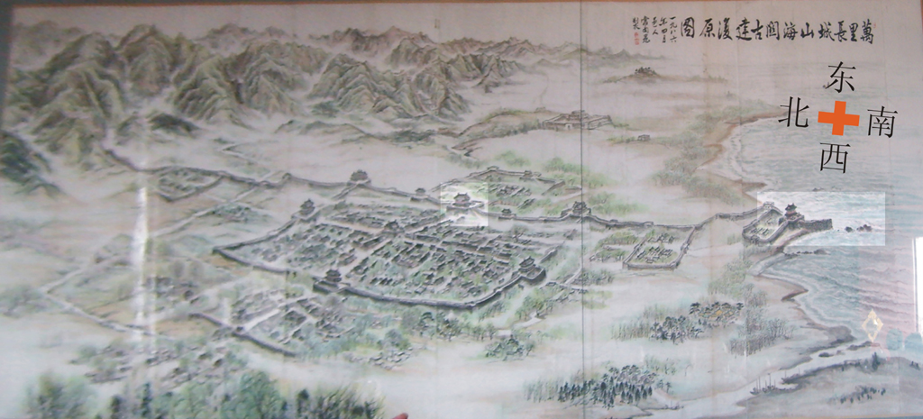 地图右边的是“老龙头”,位于山海关城南5公里的滨海高地上,为明长城东部起点。