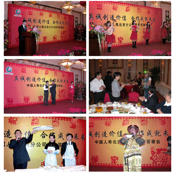 答谢会以演出现代新民乐演奏—《辉煌》开场,4人的表演显得十分有气势,使答谢会的开场气氛非常激昂。然后是领导的讲话,总结了中国人寿保险股份有限公司北京分公司06年的成绩,以及对下一年度的展望,还对到场的客户及媒体表示真诚的感谢,感谢他们对公司的支持。