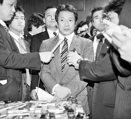 2月16日,中川昭一(中)在东京接受媒体采访 新华社/法新
