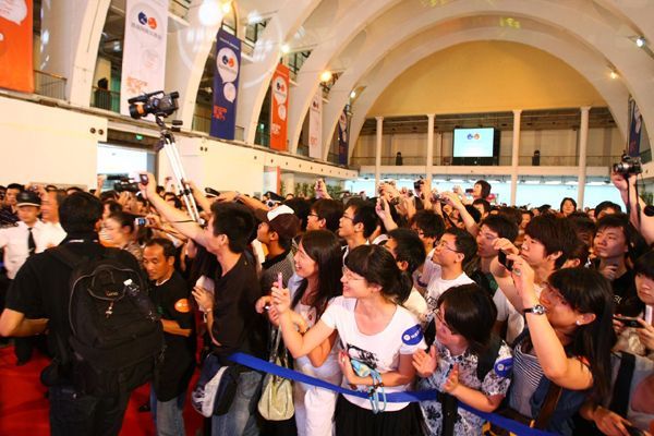 9点28分,一身白装的马云和广东省佟星副省长一行出现在千人会场红地毯门口一端。会场沸腾起来,人群向红地毯两侧压缩。网商们像追星的FANS一样,有节奏的喊着“马云、马云”,掌声随之响起。马云也微笑着向人们挥手致意。