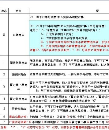 从商品状态定义看商品管理思路 本人是2002年才接触到商品状态概念。通过这一概念的接触,我深切感受到信息化、数据化管理的复杂和方便。有人会说复杂和方便不是对立的吗?确实如此。但我要说这一矛盾体其实是对立统一的。在信息化管理过程中,数据的来源具有多样性,即使是一个简单的数字,其所带来的意义仍然是很复杂的,例如:当天进货24瓶355ml可口可乐这样一个数字,其所引发的信息变化就包括:库存金额要增加24瓶可乐的金额(财务上属于借记);应付账款要增加24瓶可乐的金额(财务上属于贷记);库存可销天数要变化;仓库库位要变化。。。。。这些就是所谓的四流(票据流、信息流、商品流、资金流)合一概念,这么多信息的变化能否尽可能的少影响数据库的检索,加快反应速度,同时数据库中的数据能否直接指导日常经营工作而不是简单的数字罗列,这里商品状态就起作用了。什么是商品状态呢?即将商品从引进到淘汰过程中的不同情况以不同的数字进行标示。每一个数字代表一种该商品在零售企业中的一种特定状况。下面的图片里有我知道的几个企业和软件对商品状态的定义。从这几个企业和软件关于商品状态的定义不同,可以看出国内零售企业和台资企业在商品管理理念上的差距,国内软件更侧重于新品引进中的控制,将1-3的代码给了新品系列,而对于预淘汰和淘汰类商品(含暂时禁下单、季节性、暂时缺货等)定义得就比较笼统。而好又多和大润发的区别在于好又多更集中关心正常商品的细分,如生鲜类的A进B出、跨门店区域的差异化、子母货号的区分等,大润发更关心商品的整体结构及其进出控制,应该说各有所长。但在商品状态管理过程中,我们走访和调研了很多内资企业,甚至是比较知名的企业后发现,内资企业在数据管理这一工作中从上至下的重视度、精细度、科学性、严谨性都大大低于台资、外资,往往是商品状态设定了,但采购不及时调整商品状态,营运不及时提供商品状态调整的信息和需求。一个商品数据库,多达数万种商品都是正常商品,检索一个单品需要很长时间。实际的有效单品数往往只有一万多甚至几千。在经营过程中被淘汰的单品就应该及时调整商品状态,使正常商品数和有效单品数一致,这样能大大提高商品检索速度,提高效率。商品状态的控制成功还有以下好处:1、新品引进能得到销售追踪并推动商品结构优化、陈列调整等多项后续工作。2、淘汰商品在营采配合下及时退货、清仓,减低库存压力,提高资金使用。3、季节性商品能及时上架和下架,提供营采换季的商品清单。4、淘汰商品无法二次进场,能阻止供应商破坏商品结构。5、通过暂时禁下单商品提高谈判筹码,压迫供应商让步。。。。。。小弟写这篇帖子也希望广大同行能加入进来,讨论讨论商品状态管理的办法。请高人多多指教。