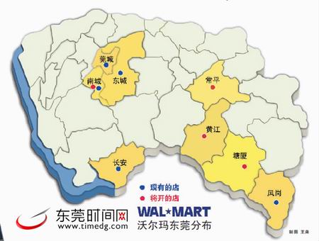 沃尔玛布局东莞 年内将完成9家门店 沃尔玛布局东莞 年内将完成9家门店  沃尔玛这个当今世界500强的零售大鳄,计划将东莞变成其在中国地级市中布局最多的城市。(记者 王欢 摄)  沃尔玛东莞分布图