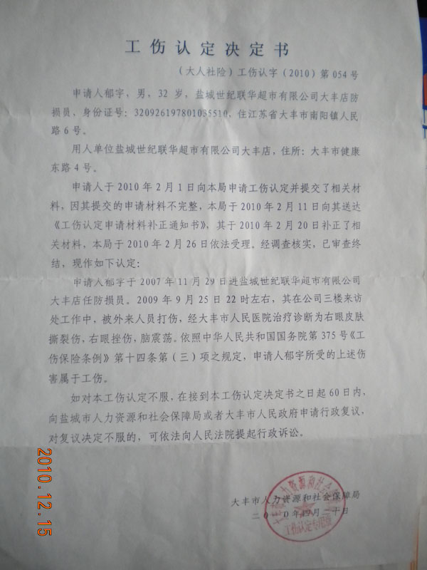 [原创]世纪联华超市欺侮一个工伤劳动者。曝料!曝料!! 盐城世纪联华超市有限公司大丰店如此欺侮一个工伤劳动者。 我老公于2007年11月29日进盐城世纪联华超市有限公司大丰店任防损员。2009年9月25日22时左右,他在公司3楼来访处工作中,被外来人员打伤,经治住院疗诊断为右眼皮肤撕裂伤,右眼挫伤,脑震荡。 后来打人者受到了行政拘留10日的治安处罚,本来我老公这也是在与违法行为作斗争,而当时的防损主管朱德良也曾承诺要给我们补助奖励。令人意想不到的是,我们不仅没有得到世纪联华一分钱医药费,反而在1个多月后于2009年11月30日收到了一纸《终止劳动合同通知书》!!! 看吧!!这就是世纪联华:面对自己员工被人打伤,心里首先想到的不是维护员工权利及时申报工伤,反而把劳动者视为累赘负担赶紧扫地出门,以为这样就能逃避自己应当承担的责任和义务。 世纪联华的险恶用心由此可见一斑!(上图)