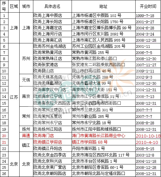 2010年欧尚在华门店最新盘点统计