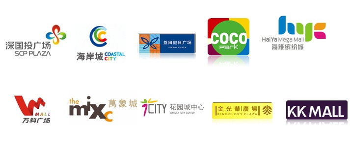 指定的深圳主要购物中心内外,具体来说有:金光华广场、万象城、mini万象城、KKMALL、信兴广场、喜荟城、深国投广场、中心城、COCO Park、皇庭广场、欢乐海岸、益田假日广场、欢乐颂、海岸城、花园城、京基百纳、海上世界、太古城、海雅缤纷城、港隆城、七巧国(原抓抓儿童城)和万科广场,共22家。