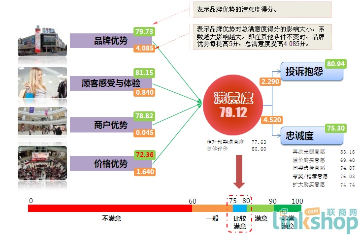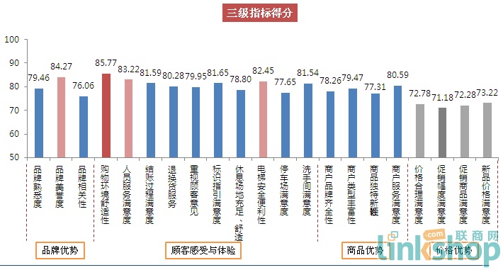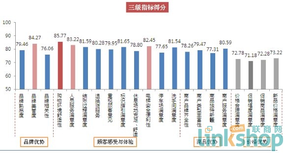 就顾客满意度的三级评价指标而言,购物环境舒适性最令顾客满意,得分85.77分;其次,品牌美誉度、人员服务和电梯安全便利性得分也较高。而价格优势的四项下级指标得分全线偏低,其中促销幅度的得分最低。