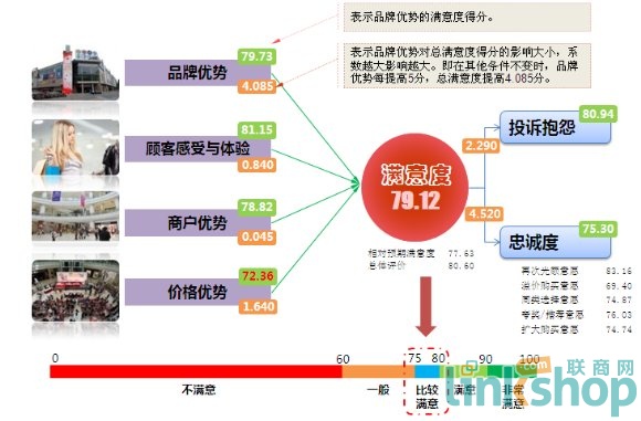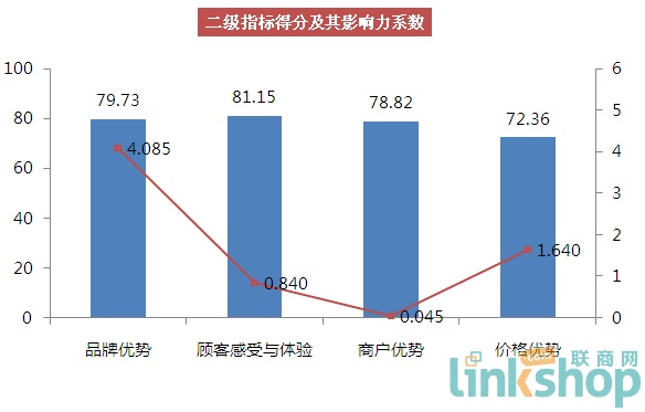 购物中心顾客满意度评价的四大二级指标中,价格优势得分明显低于其他三项,为72.36分;另外三项二级指标得分则大体相当,其中顾客感受与体验得分最高,为81.15分。就影响力而言,品牌优势对顾客满意度影响最大,商户优势影响较小。