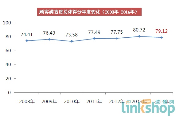 从2008年到2014年,深圳购物中心的顾客满意度总体上有小幅提升,且在近四年内日趋平稳,介于77-81分之间,多处于比较满意水平。