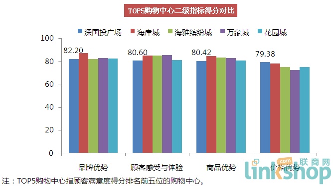 在顾客满意度排名前五位的购物中心中,深国投广场四项二级指标中的价格优势得分要高于其他购物中心,位列第一。在品牌优势和商品优势方面,海岸城最令顾客满意,在顾客感受与体验上,则万象城得分最高。