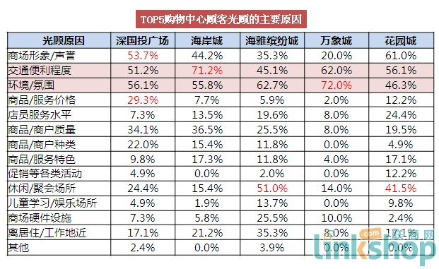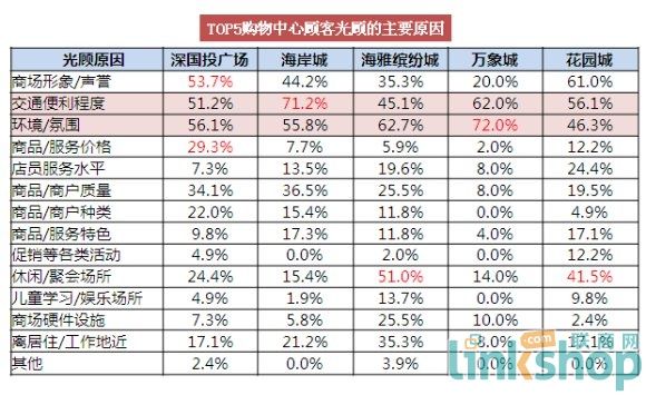 交通便利程度和环境/氛围为顾客光顾TOP5购物中心的共同性主因。