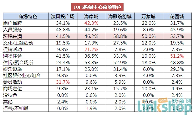 TOP5购物中心均被认为在环境装潢方面特色明显。