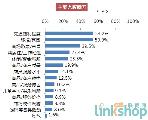 交通便利程度和环境/氛围是顾客光顾各购物中心的主要原因。
