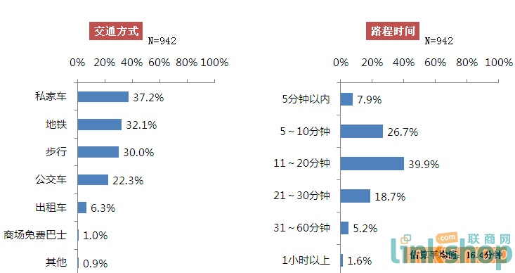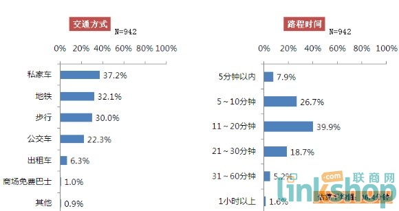 私家车为顾客前往购物中心的主要交通方式,其次为地铁和步行。