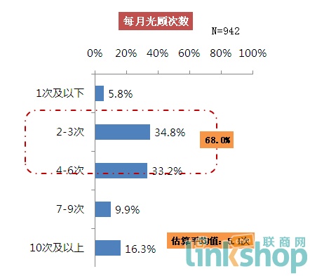 约七成顾客光顾购物中心的频次集中在每月2-6次,平均为5次/月(高于百货商场的消费次数4.8次/月)。