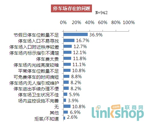 超过1/3的顾客认为购物中心的停车场存在节假日停车位数量不足的问题,在停车场存在的问题中最为突出。