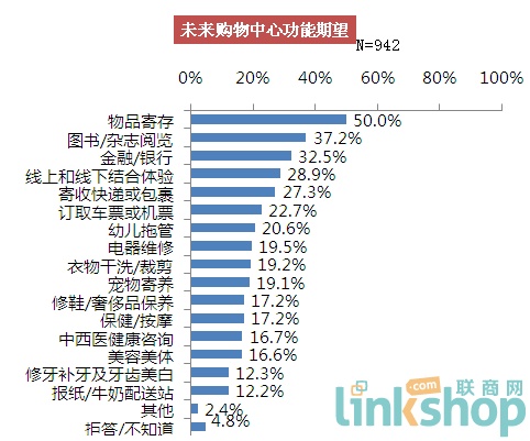 物品寄存是顾客对未来购物中心所具备功能的最大期望,有一半的顾客希望购物中心能具备这一功能。其次为图书/杂志阅览、金融/银行等。