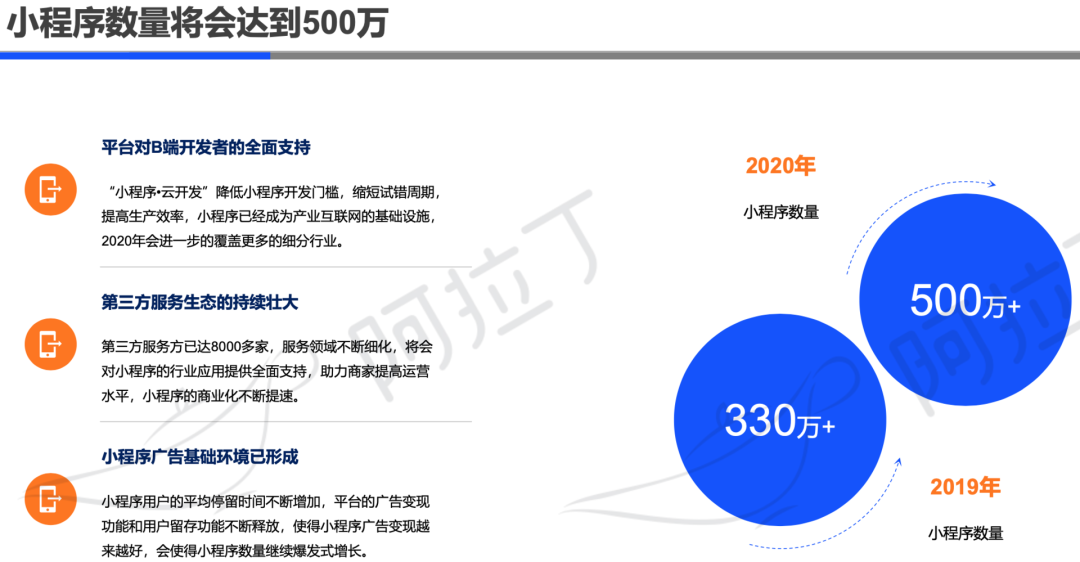 据阿拉丁指数共同发布的《2019年小程序互联网发展白皮书》,截止2019年11月,**小程序数量超过450万,据预测,2020年小程序数量会达到500万+。与此同时,第三方服务商已达8000多家。