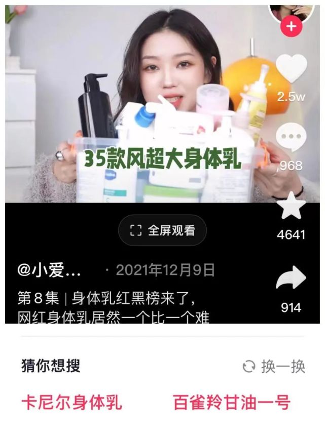 比如,当你在刷抖音时看到了一个“身体乳红黑榜”视频,看完之后是不是想看看红榜的产品到底有什么玄机、是不是还想看看“红榜”产品在其他达人口中的评价?这时,红榜品牌已经躺在了你的搜索栏中,点进产品的关键词,就能get商家自播撒出的优惠券,买到红榜身体乳产品。