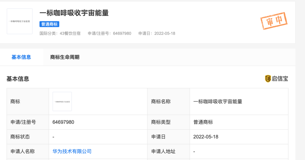 启信宝数据显示,近日华为技术有限公司(以下简称华为)申请注册“一标咖啡吸收宇宙能量”(以下简称一标咖啡)商标,国际分类为餐饮住宿,当前商标状态为等待实质审查。这一消息不禁引起市场猜测,华为也要入局咖啡赛道了?