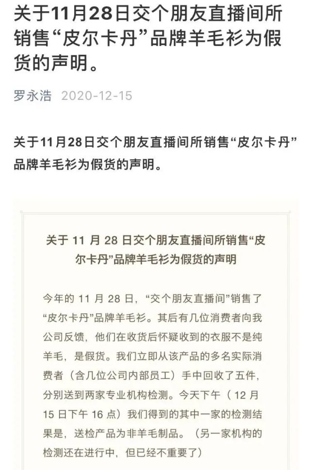 2020年3月,类似的事件又发生了。服装品牌Squarecircle官方微博发文称,薇娅直播带货时售卖的一款开衫毛衣涉嫌抄袭。该品牌表示,薇娅所售的毛衣款式、设计都与自家的商品一模一样,只是用了品质较差的纱线来替代原品。
