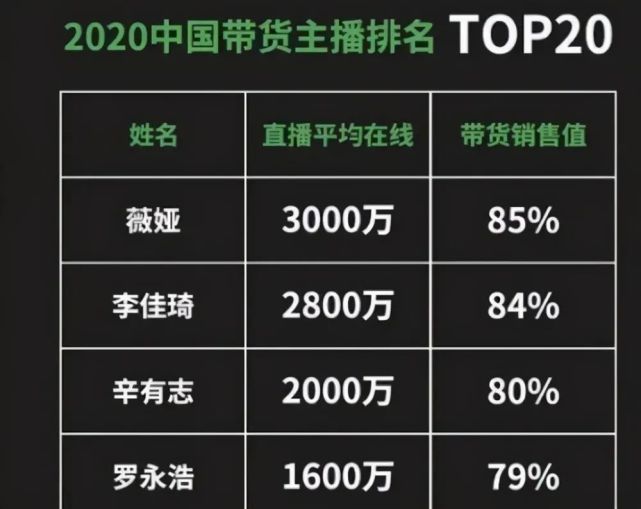 在2020年,薇娅凭3000万平均在线量和85%的带货销售值,名列当年中国带货榜单第一名,并和李佳琦、辛有志和罗永浩一起,被誉为直播界“四大天王”。