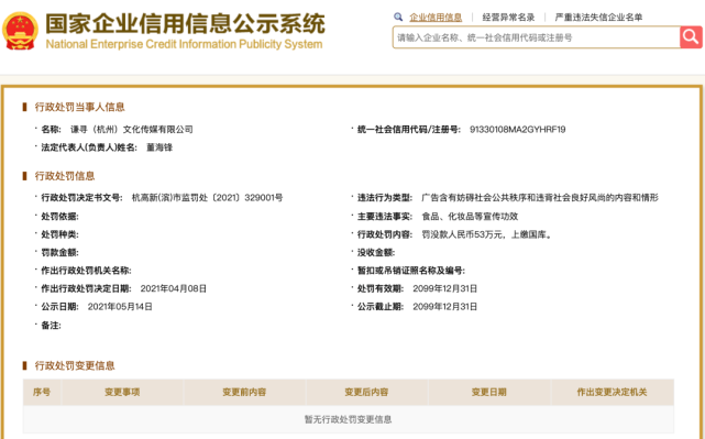 2021年4月8日,薇娅丈夫公司谦寻文化因广告含有妨碍社会公共秩序和违背社会良好风尚的内容和情形,而被行政罚没53万元。主要涉及到“食品、化妆品等违法功效宣传的事实”