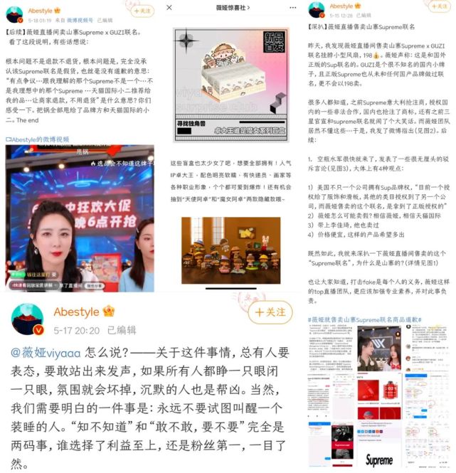 该博主表示,“很多人都知道,之前Supreme意大利抢注商,授权国内的一些非法合作,国内也抢注了商标,还有之前三星官宣和supreme联名就闹了个大笑话。而薇娅团队居然不懂这些…”更可笑的是,薇娅精选已经公认为抄袭IP的卓大王,以至于Abestyle得出了“薇娅没救了”的评论。