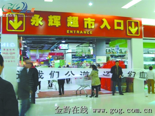 8日晚,一网友在贵州都市网发帖报料,称金阳永辉超市在合同期内无故终止商户经营权,商户通过拉横幅讨要说法时,被超市员工强行撕毁。