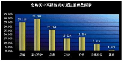款式设计成为影响中高档腕表购买者最为看重的因素,占39.08%,品牌因素占35.11%,品质因素占25.66%。这表明随着时代变迁,人们不再将计时功能放在首位,更大程度上将腕表作为彰显品位的装饰品。